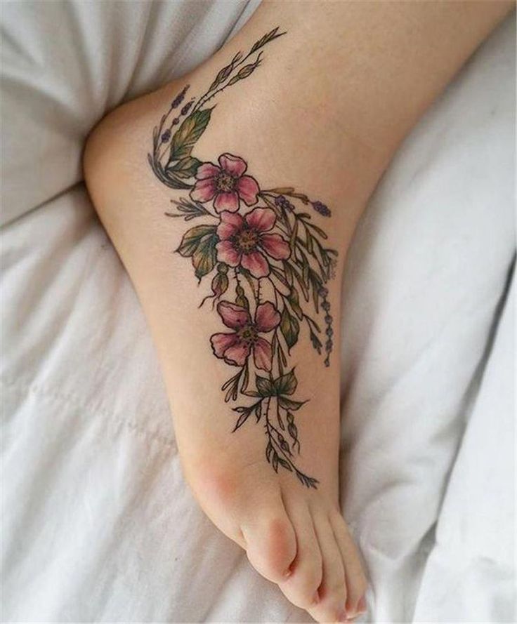 Татуировка с цветами. Девушки всегда были, есть и будут натурами романтичными и трогательными. Если вы хотите показать свой характер, выразить себя, выберите татуировку с цветком, подходящим вам по духу. Прекрасно смотрятся цветы фиалки, незабудки, лилии в качестве татуировке на ноге девушки. Замечательно будет выглядеть татуировка с красной розой, символизирующей страсть и яркость, белая роза имеет другое значение – она символизирует нежность, такая роза подчеркнет ваше молодость и красоту.