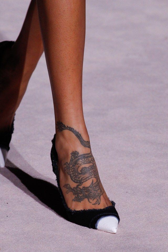 2. Тату на ноге девушкам совсем несложно скрыть, стоит лишь надеть брюки, джинсы или лосины. Большую часть года девушки проводят в закрытой обуви, поэтому и тату на лодыжке скрыть будет не слишком сложно.