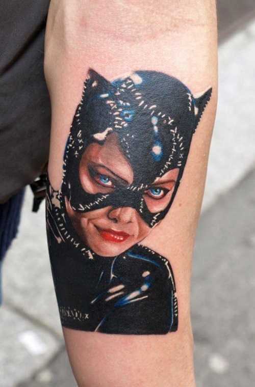 Лично мне кажется, что этот жанр больше всего характеризует именно портретная татуировка. Наиболее популярны сегодня изображения лиц известных людей, например музыкантов или актеров. На фото можно увидеть изображения в виде супергероев, например бетмена или джокера. С другой стороны, если мы определяем стиль realistic как что-то изображенное максимально естественно, то спектр возможных сюжетов сильно расширяется.