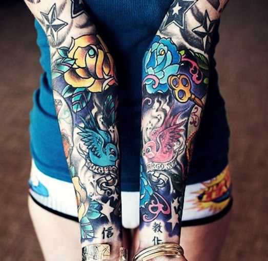 Татуировки на руках, в особенности, на запястьях, как правило, миниатюрны и изящны. Чаще всего там находят место надписи, короткие афоризмы, небольшие по размерам и лаконичные рисунки. Запястье является одним из излюбленных мест для нанесения рисунков еще и потому, что с одной стороны оно скрыто от посторонних глаз, с другой стороны – позволяет легко показать рисунок тогда, когда это необходимо. Ту же функцию чаще всего несут татуировки и на тыльной стороне руки – там обычно находят место различные знаки и символы, животные, цветы и т.д. Изображения на плече и предплечье можно найти чаще всего у женщин, имеющих мужские черты характера, последние можно также эффектно дополнять, формируя менее популярные у женщин, но также эффектные «рукава». Они как правило, опоясывают руки от плеча до запястья, укрывая всю поверхность кожи.