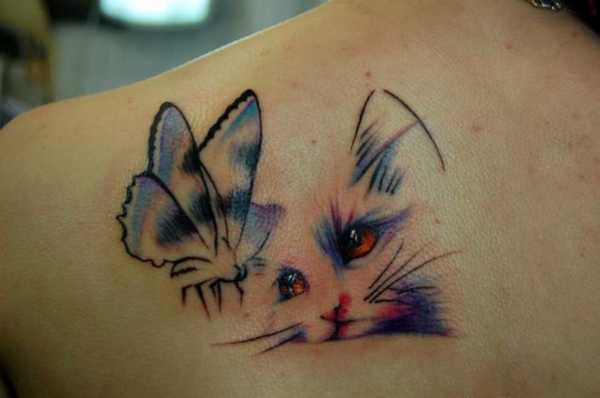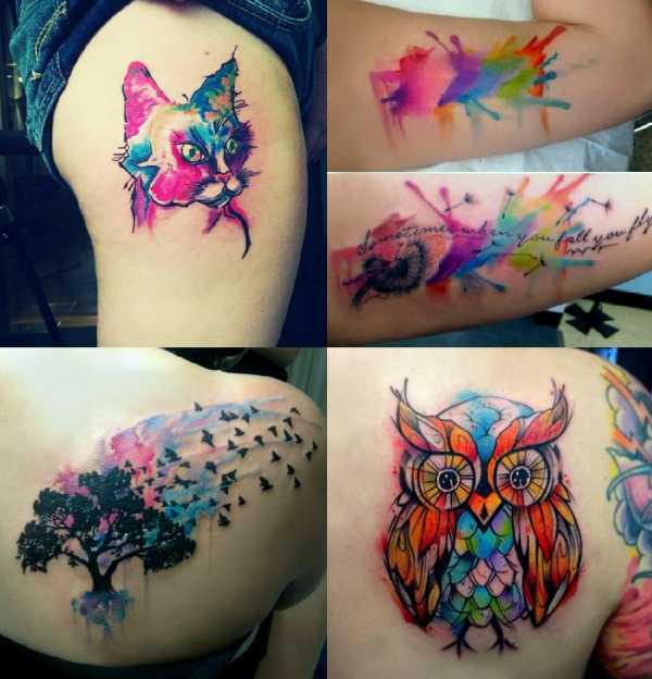- Акварель. Акварельные татуировки – это настоящая живопись, перенесенная на тело человека. Благодаря сочетанию оттенков и мягким, плавным линиям создается реальное впечатление того, что рисунок нанесен кистью. Сочетания цветов при этом может быть абсолютно любым, также как размеры рисунка и его тематика. Но, чаще всего девушки останавливают свой выбор на цветах, орнаментах, выполненных именно в этой технике.