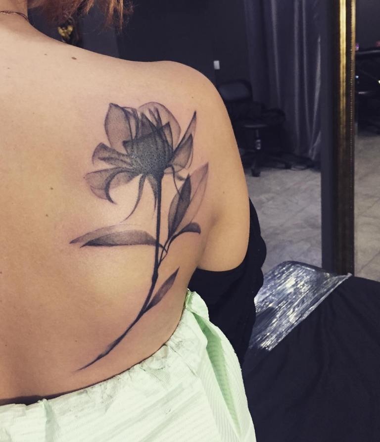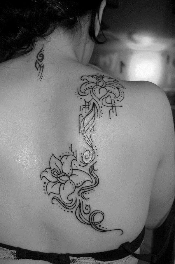 Это очень популярные у девушек рисунки. Красивые цветы подчеркивают женственность, нежность и хрупкость. Цветные композиции на лопатке в стиле акварель пользуются большим спросом, поскольку выглядят на теле как работа из художественной галереи. Гораздо реже встречаются монохромные изображения.