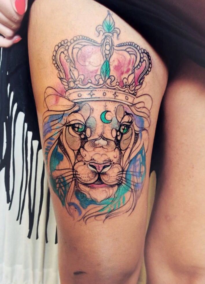 Тату Лев с короной для девушек на бедре