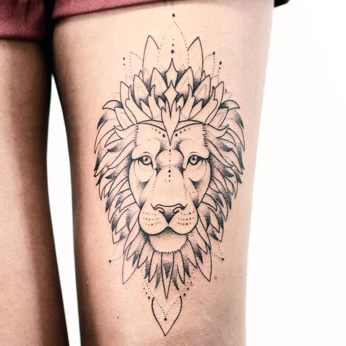 Татуировка на бедре у девушки – лев