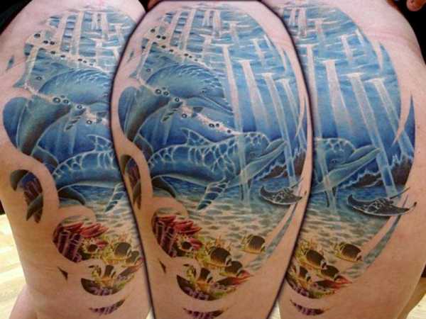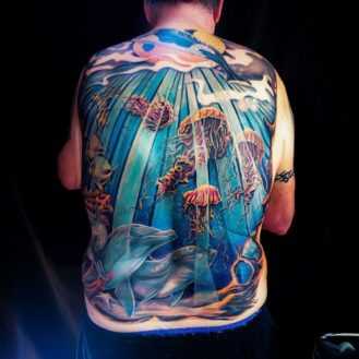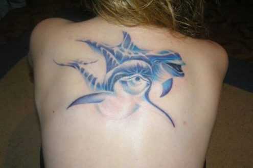 ΠΠ½ΠΎΠ³ΠΈΠ΅ ΠΌΡΠΆΡΠΈΠ½Ρ Π΄Π΅Π»Π°ΡΡ ΡΠ°ΡΡΠΈΡΠΎΠ²ΠΊΠΈ Π½Π° ΡΠΏΠΈΠ½Π΅, ΠΈΠ·ΠΎΠ±ΡΠ°ΠΆΠ°ΡΡΠΈΠ΅ ΡΠ΅Π»ΡΠΉ ΠΏΠΎΠ΄Π²ΠΎΠ΄Π½ΡΠΉ ΠΌΠΈΡ, ΡΠ΅Π½ΡΡΠΎΠΌ ΠΊΠΎΡΠΎΡΠΎΠ³ΠΎ Π²ΡΡΡΡΠΏΠ°Π΅Ρ Π΄Π΅Π»ΡΡΠΈΠ½. ΠΡΡΠ΅ΠΊΡΠ½ΠΎ Π²ΡΠ³Π»ΡΠ΄ΠΈΡ ΡΠ°ΡΡ Π² ΡΡΠΈΠ»Π΅ ΠΌΠ°ΠΎΡΠΈ. Π§Π΅ΡΠΊΠΈΠ΅ Π³ΡΠ°ΡΠΈΡΠ΅ΡΠΊΠΈΠ΅ Π»ΠΈΠ½ΠΈΠΈ, Π½Π°ΠΌΠ΅ΠΊΠ°ΡΡΠΈΠ΅ Π½Π° ΡΠ΅Π»ΠΎ ΠΆΠΈΠ²ΠΎΡΠ½ΠΎΠ³ΠΎ, ΠΈ ΠΎΡΠ½Π°ΠΌΠ΅Π½Ρ ΡΡΠ½ΠΈΡΠ΅ΡΠΊΠΎΠ³ΠΎ Ρ Π°ΡΠ°ΠΊΡΠ΅ΡΠ° ΠΏΡΠΈΠ΄Π°Π΄ΡΡ ΠΎΡΠΎΠ±ΠΎΠ΅ Π·Π½Π°ΡΠ΅Π½ΠΈΠ΅ ΡΠΈΡΡΠ½ΠΊΡ.