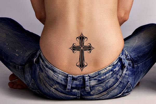 Тату цветы и крест на пояснице у девушки