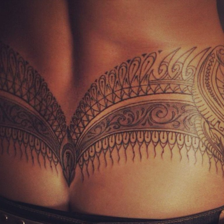 • татуировки для девушек на пояснице в виде орнамента. Это может быть как классический вариант узора, в стиле трайбл, который пользуется неизменной популярностью уже много лет, так и новые разновидности. К ним можно отнести восточную роспись, буддистские узоры, имитацию кружева в стиле барокко. Любой из вариантов смотрится женственно и пикантно;