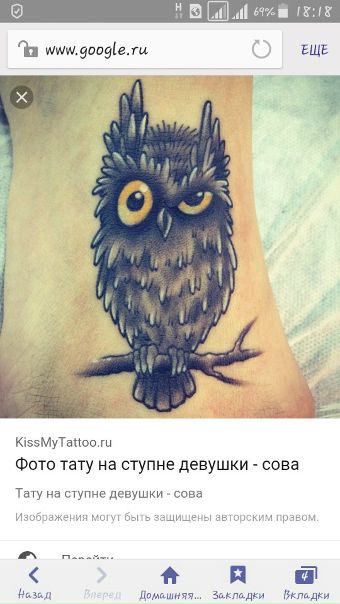 - Левую ступню девушки украшают совой, если ищут для себя опору. На правой ступне тату делают эгоистичные девушки, стремящиеся подчинять себе других.