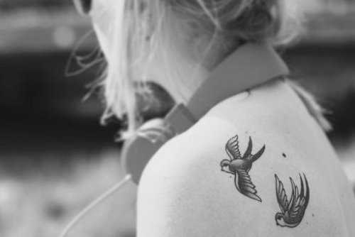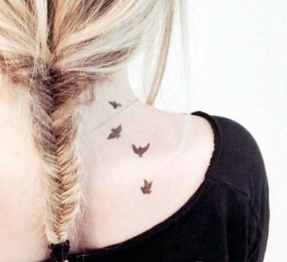Другой распространенной частью тела для небольших татуировок являются плечи, затылок, область шеи и кожа за ухом. Рисунки в этих местах позволяют сделать акцент на тонком стане девушки, подчеркнуть изящество и плавность линий.