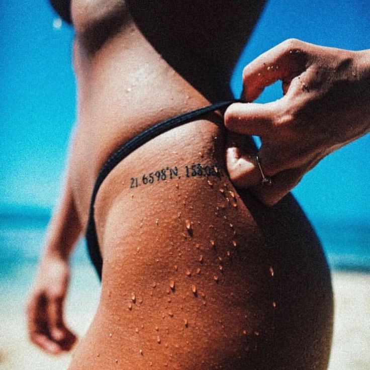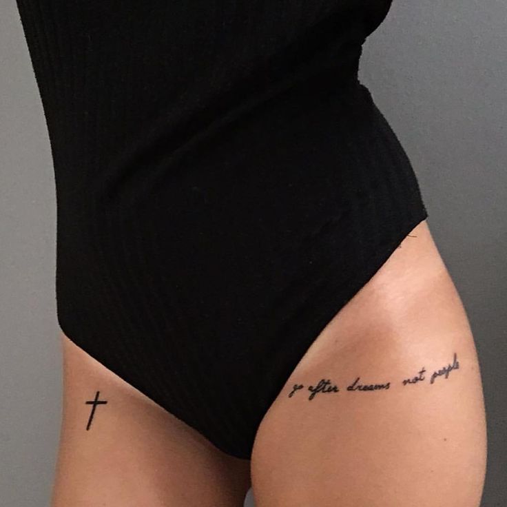 На верхней части бедра – достаточно интимная зона, которую демонстрировать можно на пляже и перед любимым человеком. Здесь лучше выбирать лаконичные, но емкие надписи, способные «зацепить» не длиной, а смыслом.