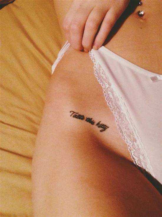 - Надписи. Фразы или отдельные слова на английском, латыни или китайскими иероглифами стали очень популярными для интимного тату. Считается, что такие надписи могут изменить жизнь человека, подтолкнуть его на свершение каких-либо подвигов или просто уберечь от невзгод. Правда, по какой причине девушки стали набивать их в скрытых зонах, до сих пор не совсем понятно.