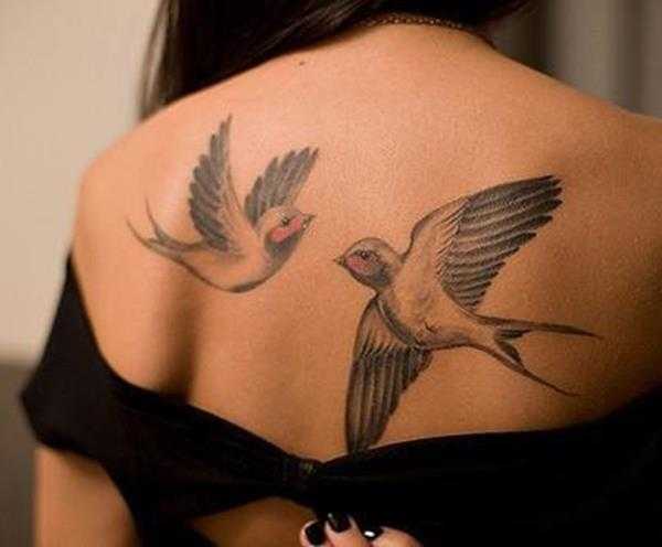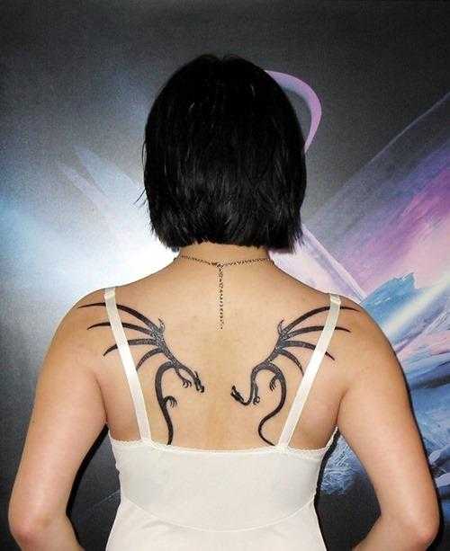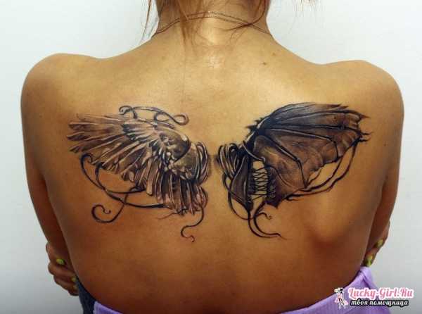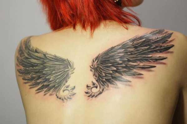 Как и мужчины, девушки часто выбирают в качестве тату на спине крылья. Некоторые люди считают, что такие изображения символизируют ангелов, полет и свободу. Как правило, крылья должны располагаться симметрично на обоих плечах.