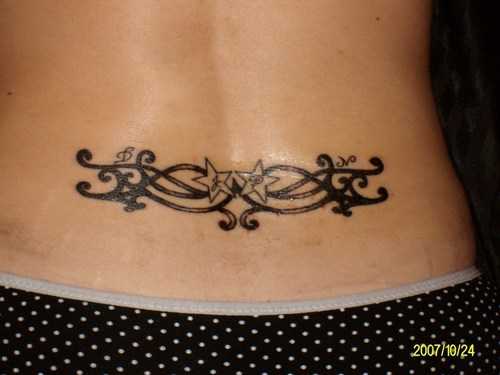На спине можно создать симметричный рисунок, поскольку позвоночник делит ее ровно пополам. Рисунки с широкими краями, сужающиеся к центру, смотрятся очень круто. Часто тату на спине имеют множество завитков и узоров. Многие девушки изображают бабочек, цветочные композиции и рисунки в стиле трайбл. Последние смотрятся отлично на любой части тела и низ спины не стал исключением.