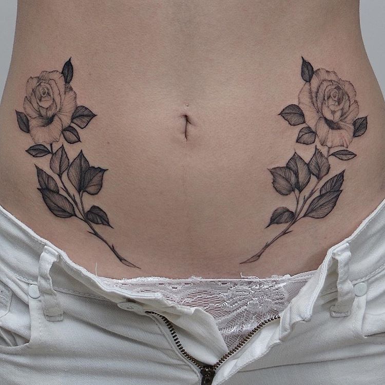 - Большая роза, переплетающаяся с каждой стороны живота и соединяющаяся внизу, ниже пупка