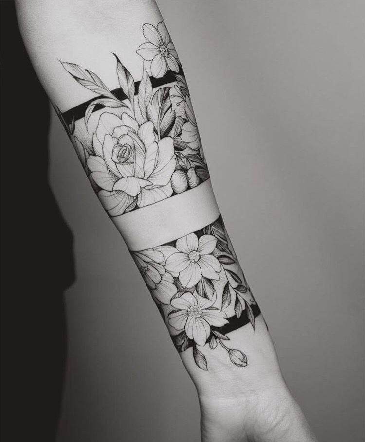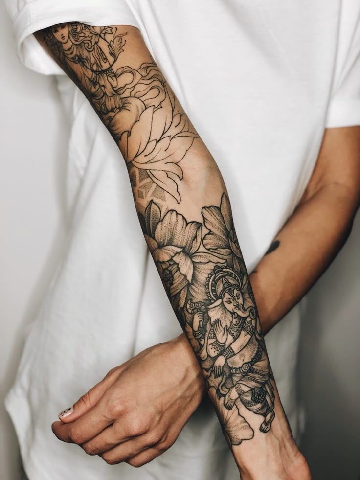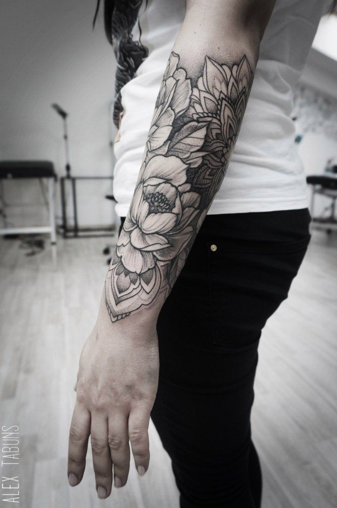 Цветочные татуировки женственны, элегантны и символизируют жизнь во всей ее красоте. Половина рукава может быть выполнена в виде большого одиночного цветка или букета. Цветок может олицетворять что угодно, от надежды до силы, поэтому сфера его значения выходит далеко за рамки красоты и боди-арта.