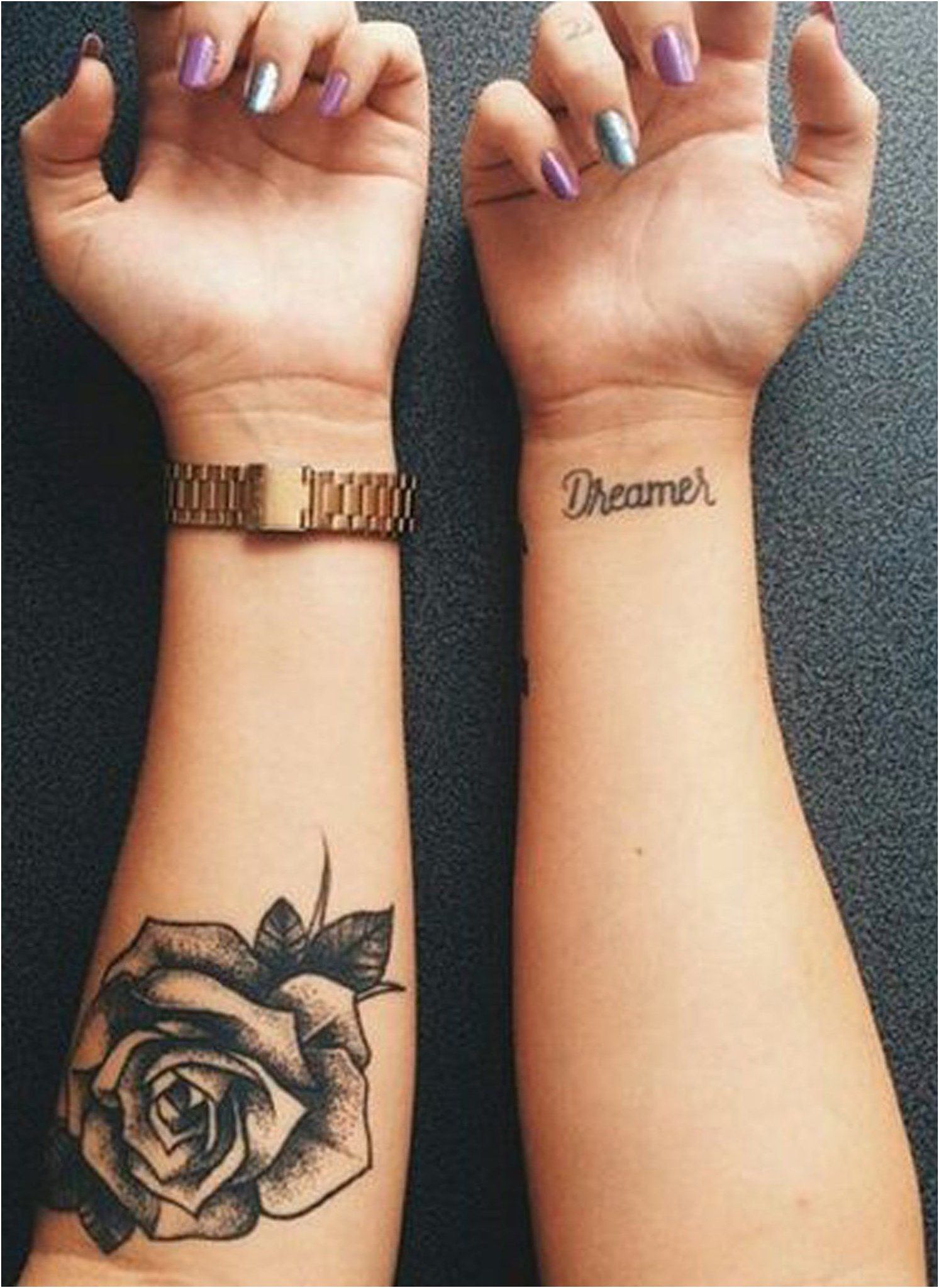 - Имена/инициалы детей, дополненные датами рождения. Тату преимущественно черно-белая.