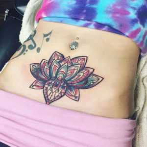Поговорим по поводу зон на животе, популярных для нанесения тату. На животе у девушек это зона вниз от пупка, как посередине, так и по бокам, так же часто делают тату в зоне от груди до пупка.
