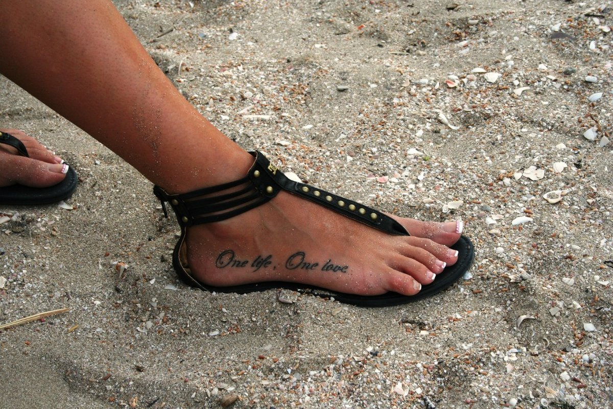Последней модной тенденцией среди представительниц прекрасного пола стало небольшое тату на ступне. Чаще всего их располагают на боковой и верхней поверхности. Такие надписи хорошо просматриваются окружающими и прекрасно сочетаются с открытой обувью. В последнее время для тату на ступне девушки все чаще выбирают латинские и арабские буквы, отодвигая тем самым на задний план популярные когда-то японские и китайские иероглифы. Такие надписи смотрятся очень нежно и редко несут какой-то смысл.