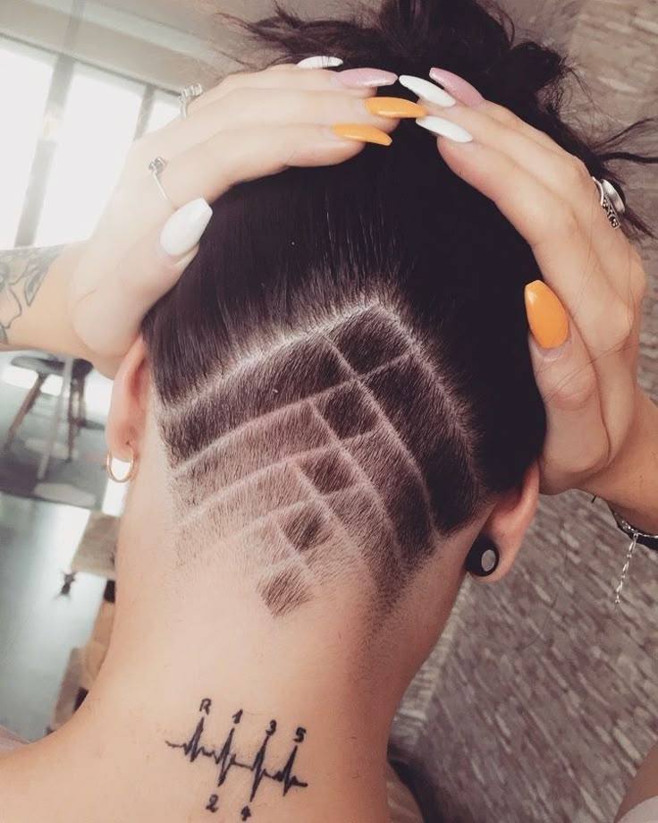 Здесь уже простор для фантазии больше. Да и девушкам с локонами такой длины спрятать свою новую стрижку уже вряд ли получится. Как и в случае с длинными волосами, выбривают либо просто затылок, либо потом на нем создают различные узоры.