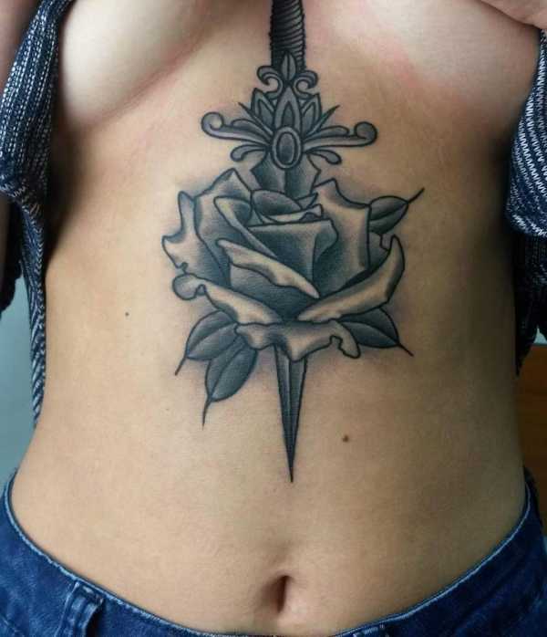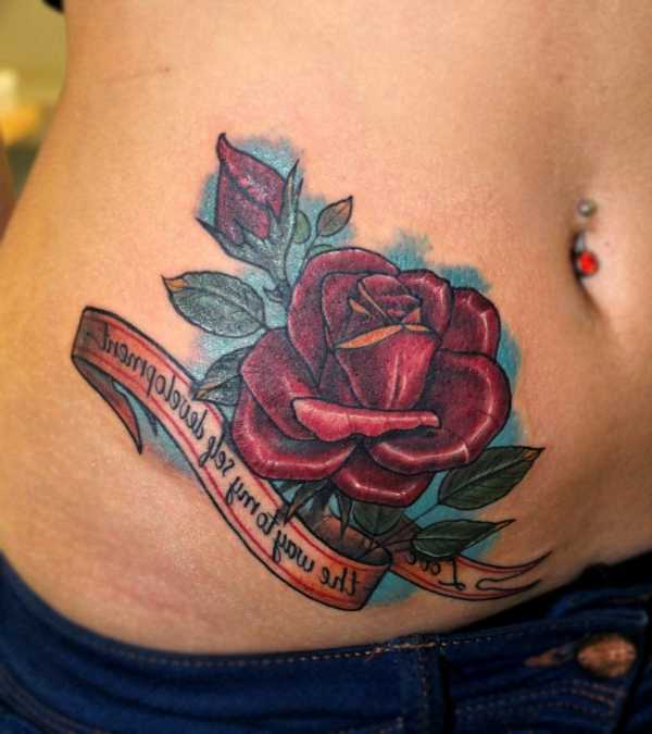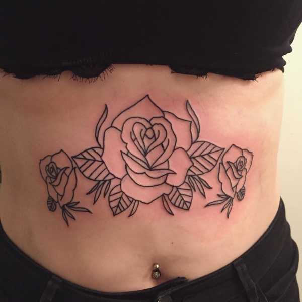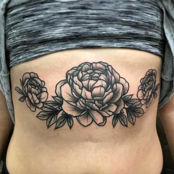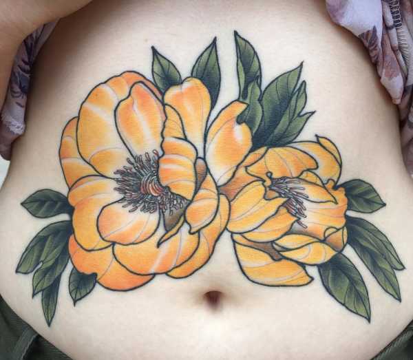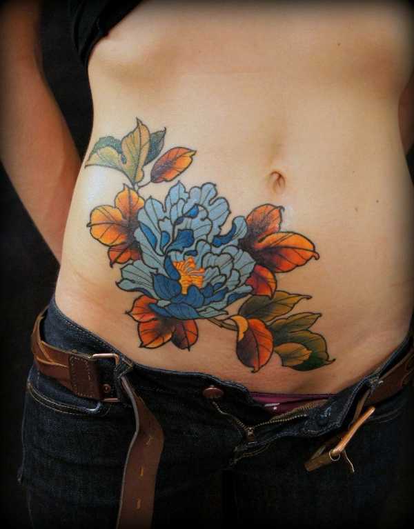 Для маскировки проблемных зон живота используются тату цветы на животе у девушек в виде букетов: роз – как символ красоты; пиона – долголетия; твердость характера прочеркнет чертополох; женственность – демонстрирующие полевые цветы.