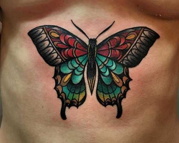 Нанесение татуировки с использованием теней и света смотрится очень реалистично и объемно. Если, к примеру, наколота бабочка, то со стороны кажется, что она живая и только что присела на живот.