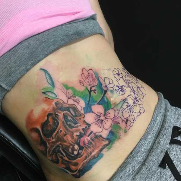 Кроме послеоперационных или других шрамов, поводом к нанесению тату на живот может выступать некрасивое родимое пятно, которое также можно украсить и тем самым сделать совершенно незаметным. Таким же способом можно спрятать выраженные шрамы от ожогов.