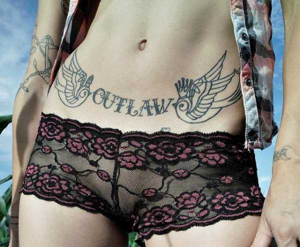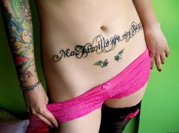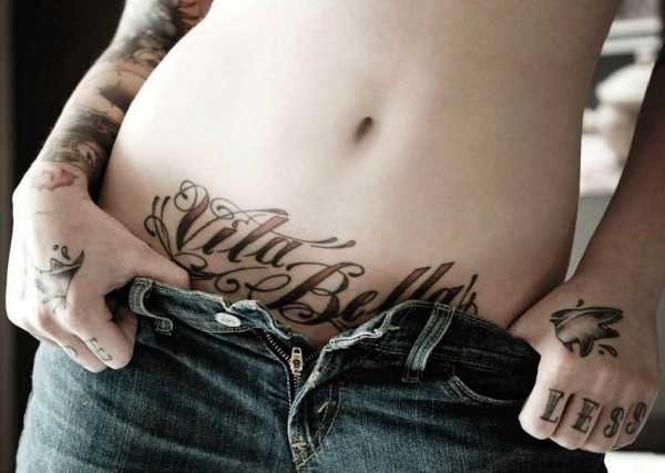 - Внизу живота делают надписи или узоры. Желательно делать небольшие изящные татуировки.