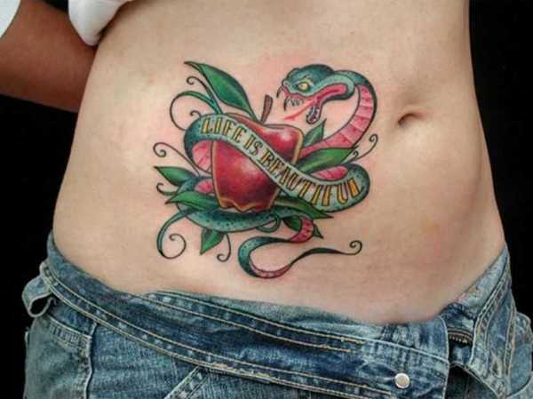 - Живот – это довольно сложное место для нанесения татуировок. Приятных ощущений процесс нанесения татуировки на живот у девушки точно не вызовет. Живот считается очень чувствительным местом, поэтому нанести татуировку на него сразу может и не получиться. Часто татуировки на животе девушкам приходится делать в несколько сеансов, ведь эта процедура довольно болезненна и перенести ее сразу непросто. Намного менее болезненной считается процедура нанесения татуировки на шею сзади или на лопатки.