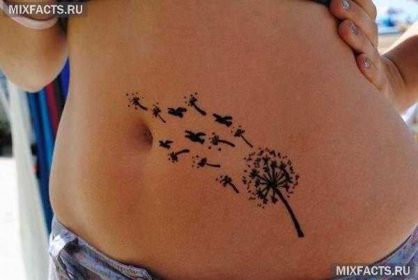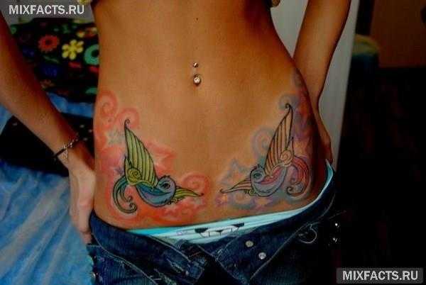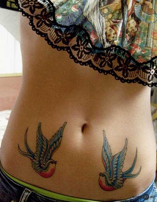 Практичные и стеснительные дамы зачастую отдают свое предпочтение изображениям летящей стаи птиц. Они особенно красиво и гармонично смотрятся в области живота. Кошечки, львы, бабочки, змеи и даже божьи коровки – вот что предпочитают наносить на свое тело молодые девушки.
