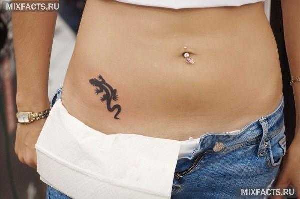 - Ящерица. Не трудно догадаться, что ящерица на животе является символом изворотливости и хитрости.