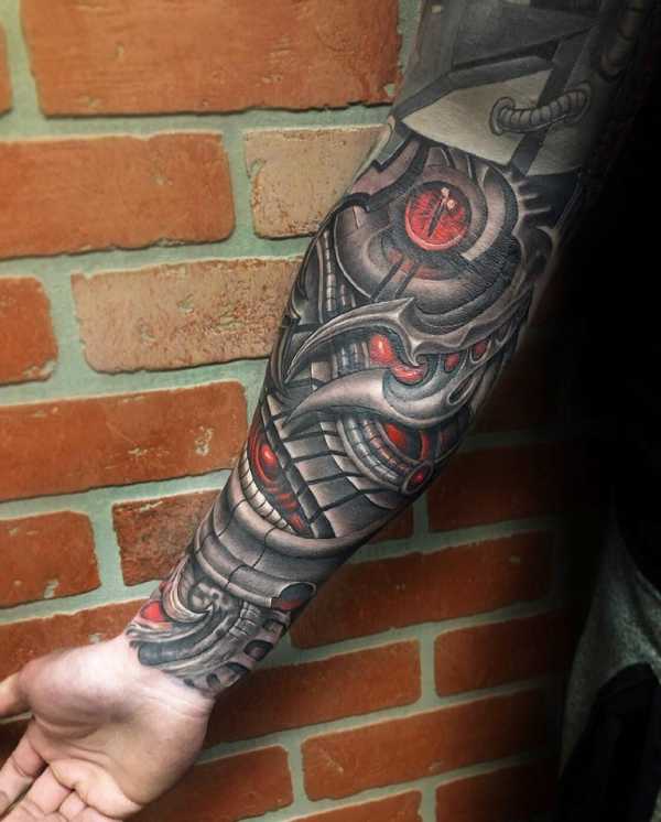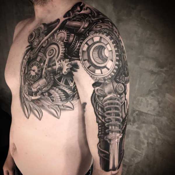 Тату рукав биомеханика, очень классно смотрится когда состоит полностью из множества, различного диаметра шестеренок и поршней, работающих на сгибание и разгибание руки.