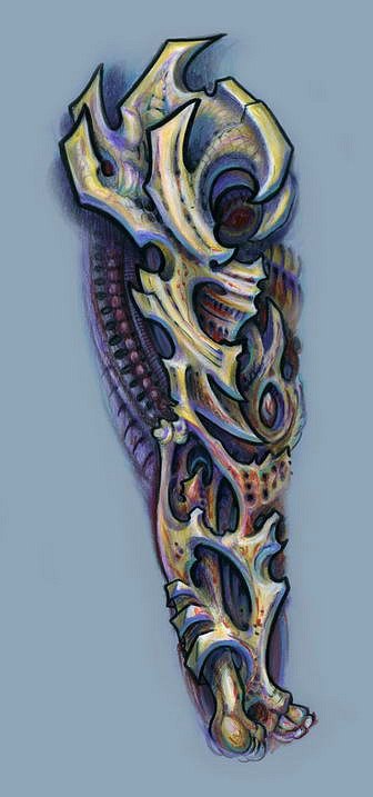 Типичный биоорганический дизайн татуировки состоит из различных элементов анатомии человека и научной фантастики.