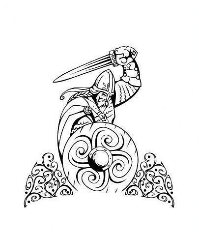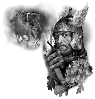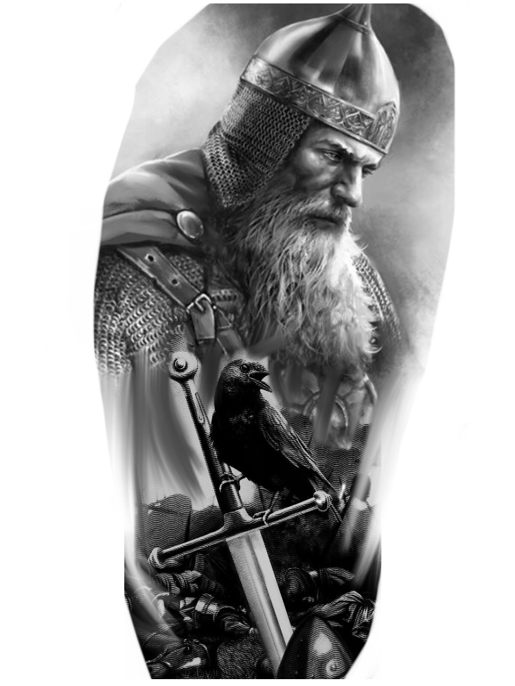 Эскиз такой татуировки может быть ограничен только вашей фантазией. Древнерусский воин может быть изображен в сопровождении дружины или в гордом одиночестве.