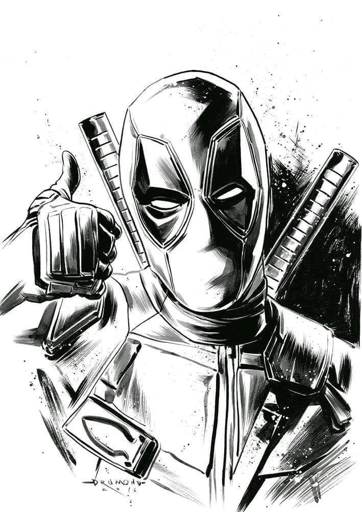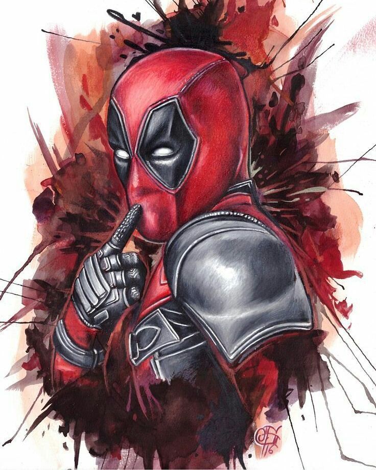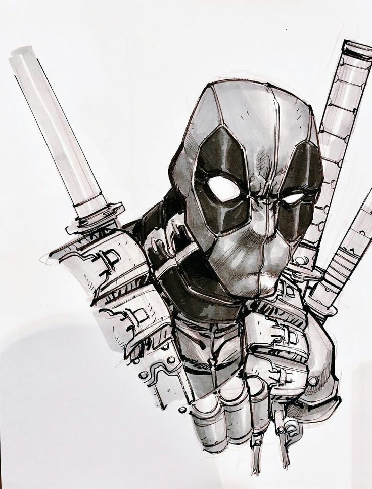 На эскизе портрет марвеловского персонажа часто дополняется мотивирующими надписями или цитатами. Часто Дэдпул изображается в образе милого малыша.