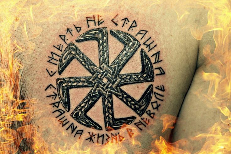 Коловрат – спорная татуировка. Десятилетие назад она была очень популярна. Сейчас ее популярность падает. Этот славянский символ подойдет патриотам России.