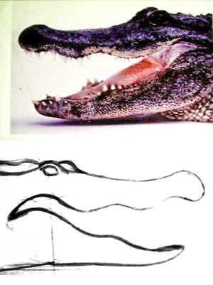 Когда я решила поучиться рисовать крокодилью пасть и стала рассматривать в интернете профили хищника, то ,прежде всего, удивилась извилистости и какой-то ухабистости челюстей. Синусоиды, ей-богу. Но, приглядевшись, я увидела, что линии верхней и нижней челюстей чётко совмещаются. Пасть открывается гораздо дальше глаза – чуть не до шеи. Правда, там есть мембраны, препятствующие выпадению пищи из разверстой пасти. .