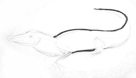 На этом этапе рисуем контур тела крокодила: туловище, лапы и хвост.