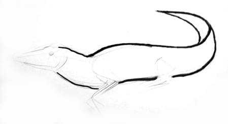 Наметим расположение лап. Хотя зверь и изогнут лапы-то всё равно растут из тела парами и правая-напротив левой. Казалось бы, о чём тут говорить – само собой понятно, но на деле многие пытаются расположить лапы по изгибам тела, а не по реальному строению скелета рептилии.