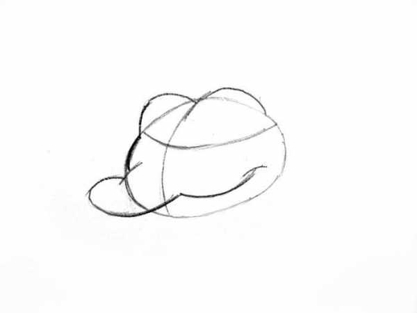 Начинаем с головы. Рисуем овал и намечаем две изогнутые осевые линии. Данные линии нам необходимы для того, чтобы правильно строить элементы головы без перекосов и несоответствий. Стоит отметить, что голова здесь для наглядности представлена крупно, почти во весь лист, однако вам стоит оставить место, чтобы уместить остальную часть крокодила.