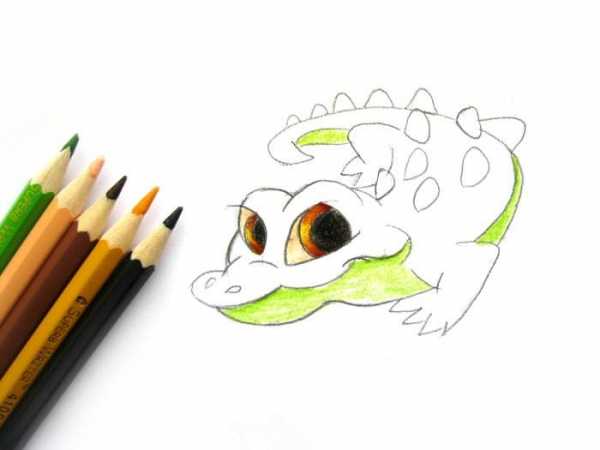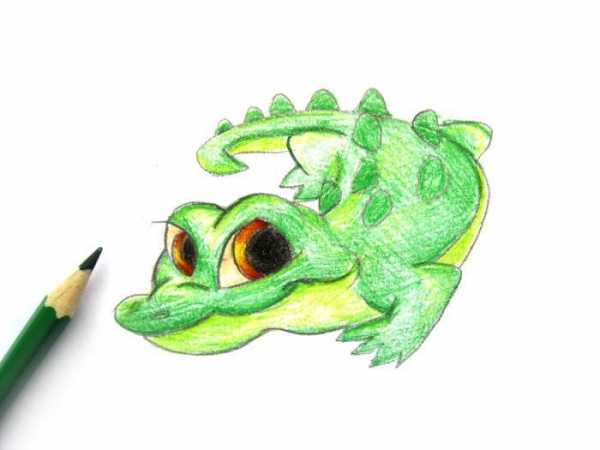 После того как весь крокодил закрашен, берём тёмный карандаш и делаем чёткими ранее нарисованные линии, так как из-за прорисовки цвета они стали незаметными.