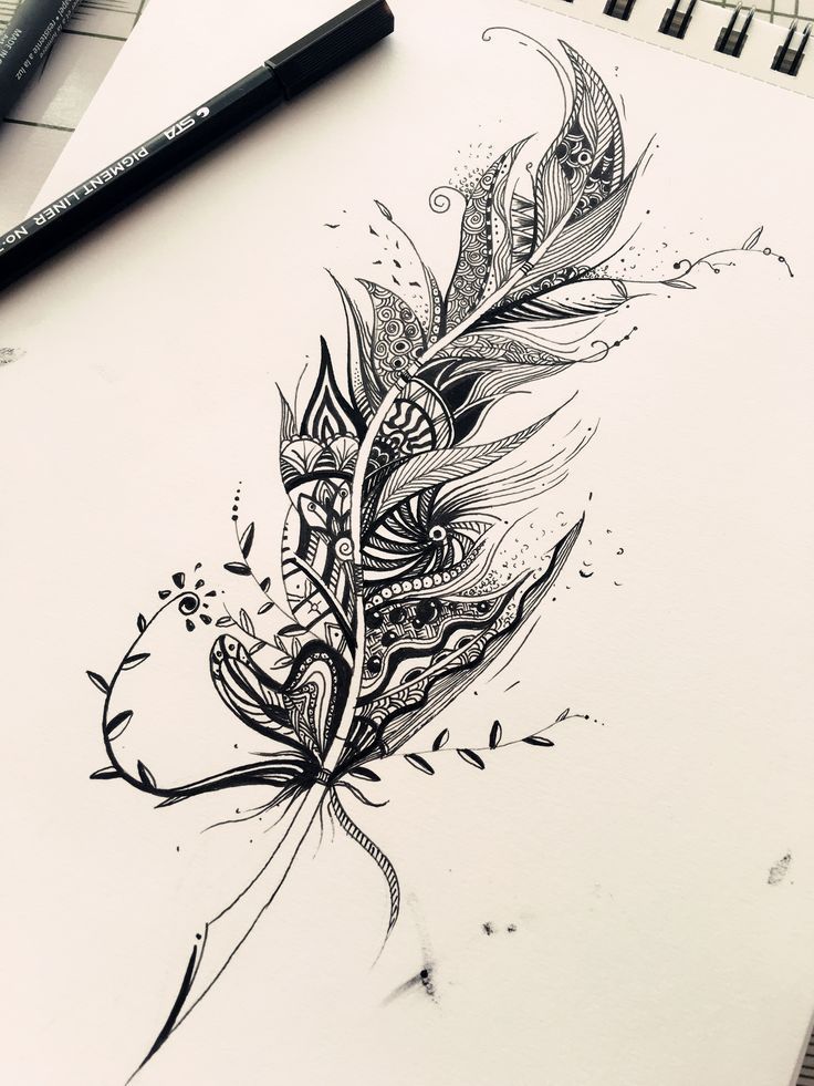Рисунок в виде пера может быть самостоятельным, выполненным в определённом стиле, или частью тату, как один из элементов общей композиции. Определённый дизайн картинки и сочетание с другими предметами придают татуировке новый смысл: