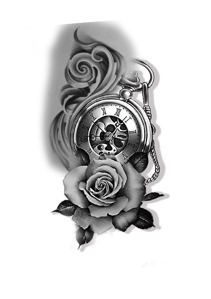 В отличие от обычных методов трассировки, использование трафарета вместо этого экономит больше времени, а также снижает риск риска. Эта техника очень популярна у тату-мастеров. На этом изображении рисунок состоит только из контура розы и часов. Выглядит очень просто и в то же время привлекательно. Если вам не нужен драматический дизайн, вы можете выбрать этот вариант.