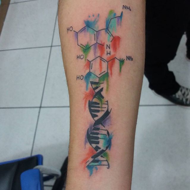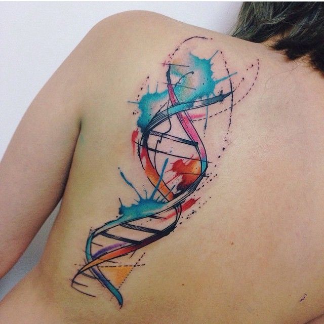 Этот дизайн татуировки делает именно то, для чего он предназначен, и выглядит красиво. Широкое использование цветов в татуировке создает волнообразный рисунок, который заполняет пустоту в образце ДНК и делает его лучше, чем черно-белое изображение.