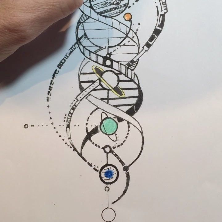 .Основа ДНК создана в виде дерева, так как в его основе есть корни, а вокруг каждой нити обернута планета. Дизайн заканчивается горой на самой вершине татуировки с большим количеством планет вокруг нее.