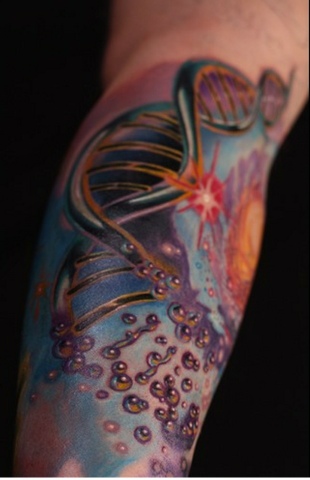 А тату молекула ДНК заставляет задуматься о происхождении и эволюции всего живого и о возможностях человека, полученных им в результате открытия этой молекулы.