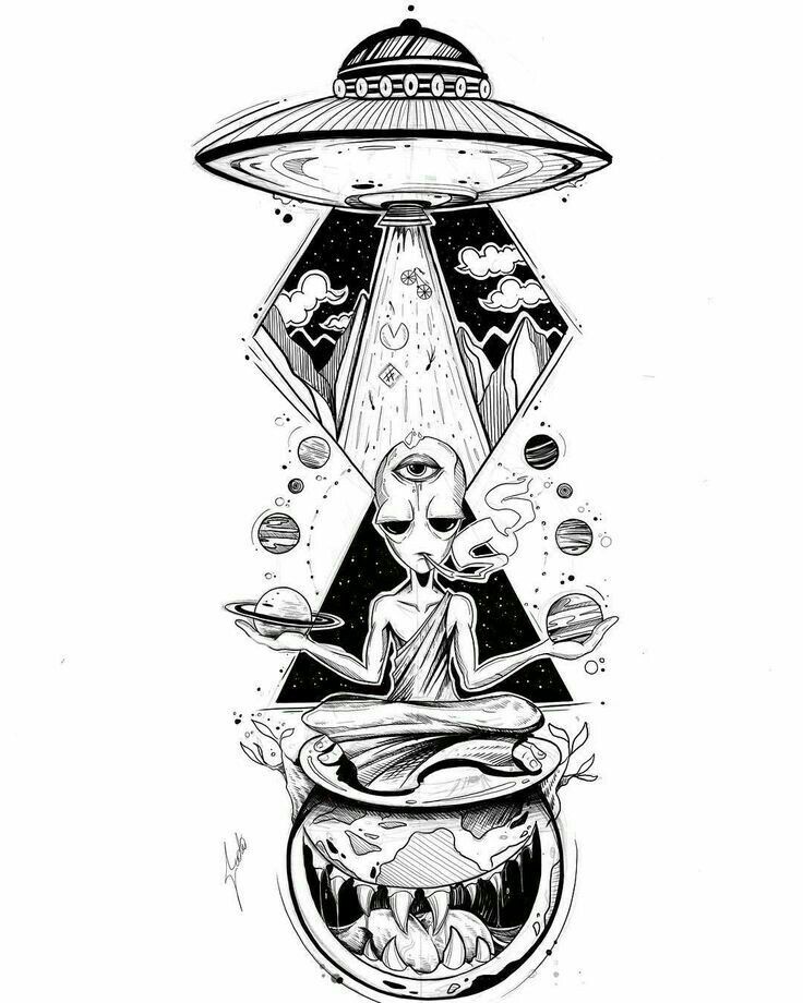 Впечатляет! Похищение инопланетянами как татуировка негативного пространства очень хорошо проиллюстрирована на бедре человека. Здесь сосны символизируют изобилие. Линейно-лучевые работы выполнены очень профессионально.