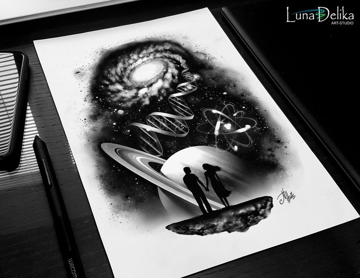Несмотря на то, что сегодня встречается большое количество цветных исполнений татуировок, тату космос в черно-белом цвете остается актуальной.