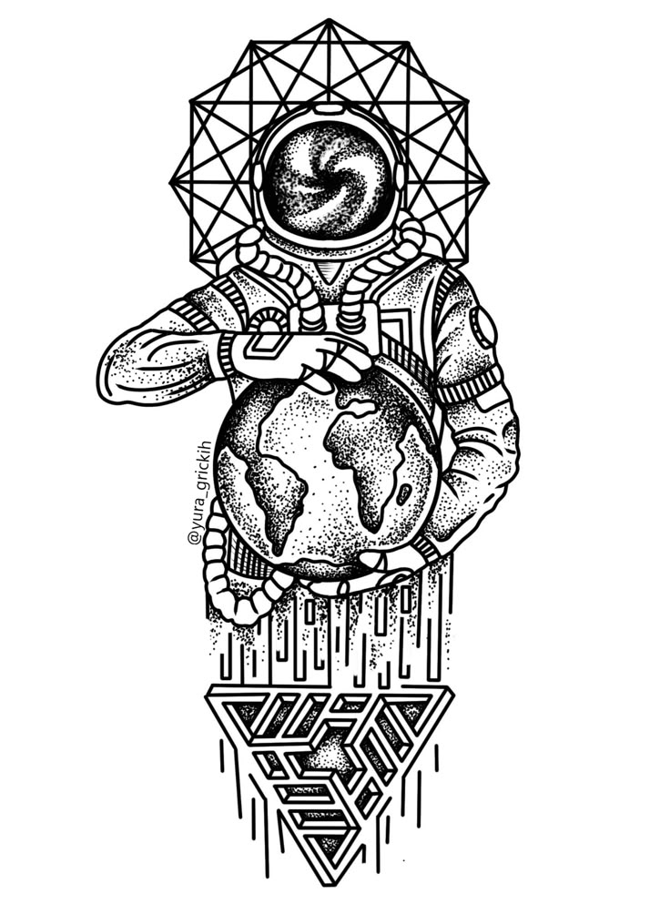 Тату «космос» выполняются в виде отдельных символов и рисунков, крупных композиций, включающих планеты, спутники, звезды и созвездия, космические корабли и космонавтов.
