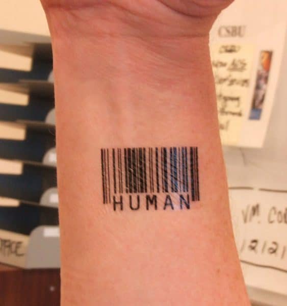 Все знают, что штрих-коды используются для маркировки товаров и представляют собой чёрные и белые линии, разные по толщине и дополненные цифрами. За ним, как правило, скрывается зашифрованная информация, содержащая данные о стоимости и производителе. Для их считывания используется специальный сканер. Татуировки со штрих-кодом являются проявлением протеста против приравнивания людей к бесчеловечным товарам.