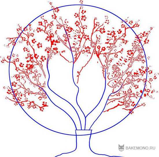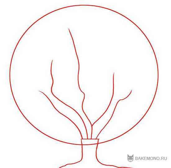 Нарисуйте большой круг, который будет использован в дальнейшем для границ цветущих веток. После нарисуйте небольшой пенек с корнями и идущими из него несколько веток. Ветки рисуйте тонкой неровной линией, как показано на примере.